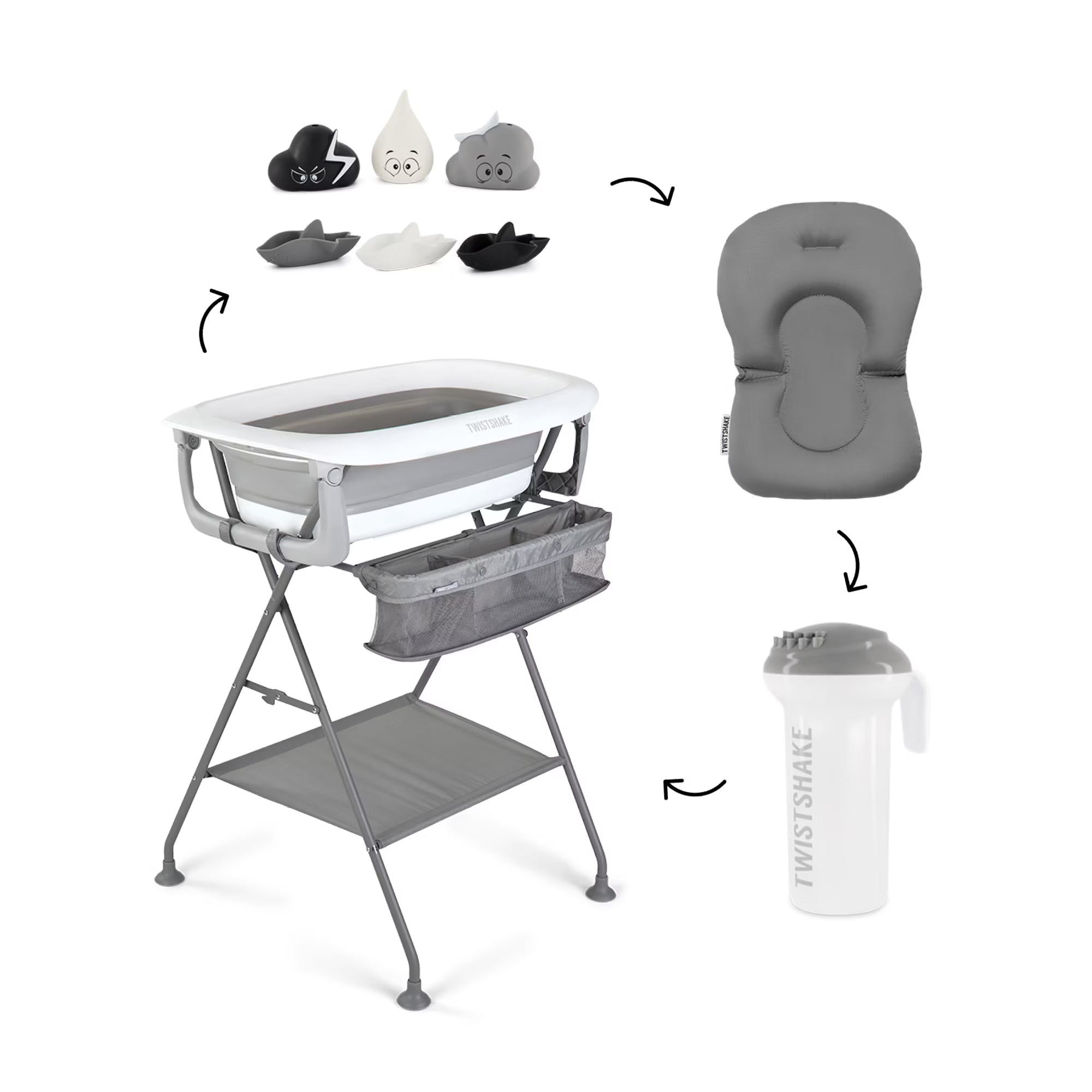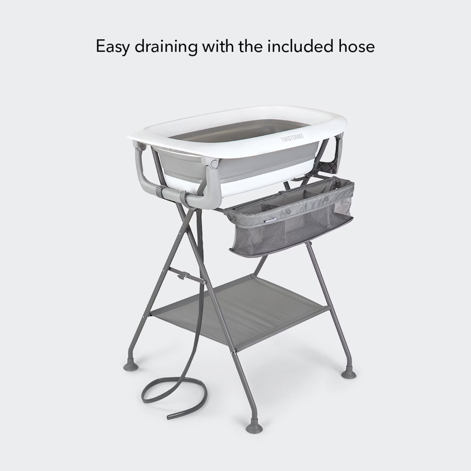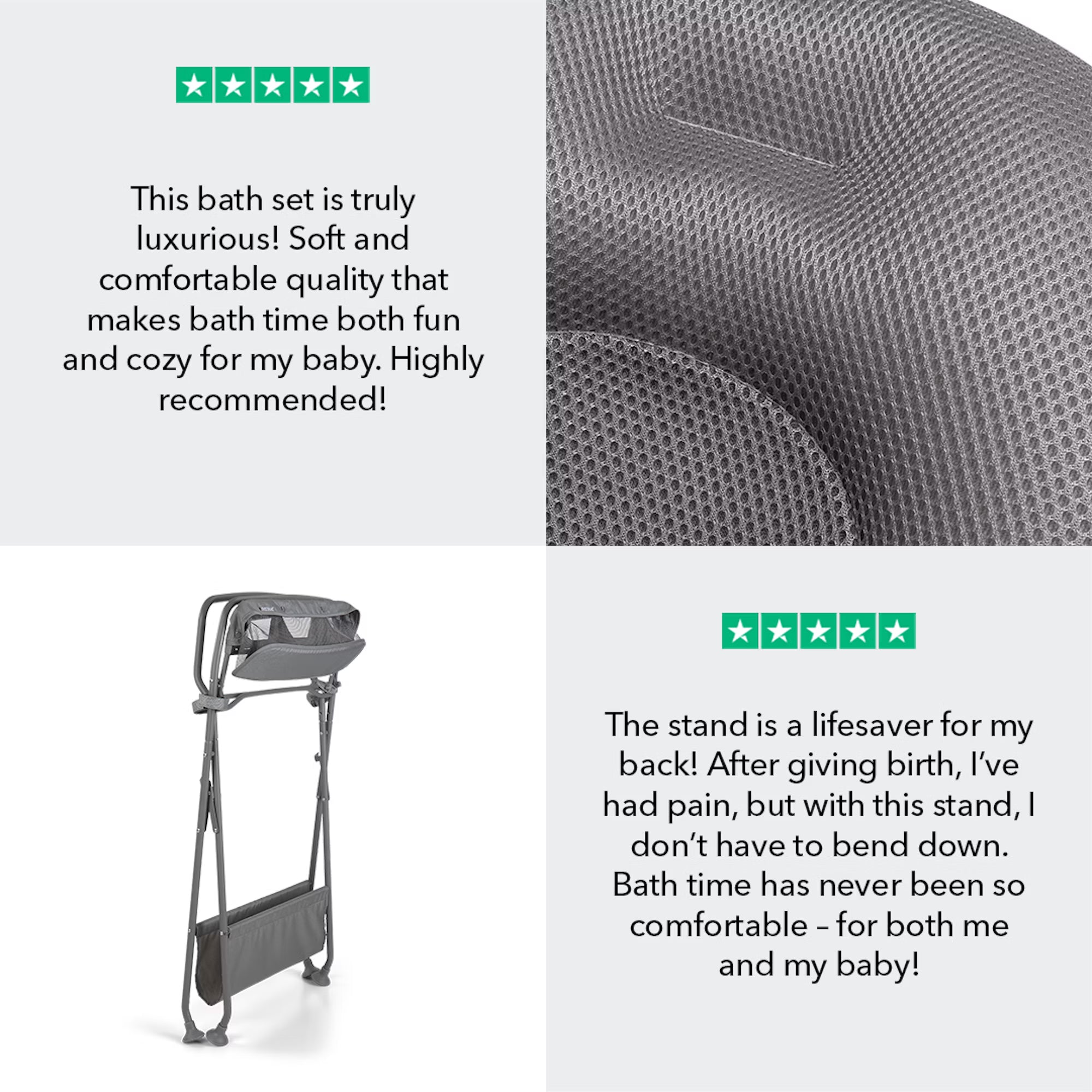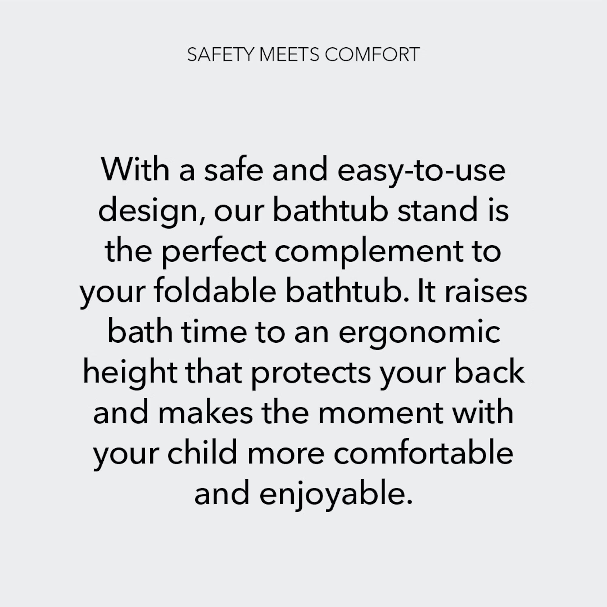 soft cushion, while the stand lifts bath time to a comfortable height that spares your back. Smart, practical, and